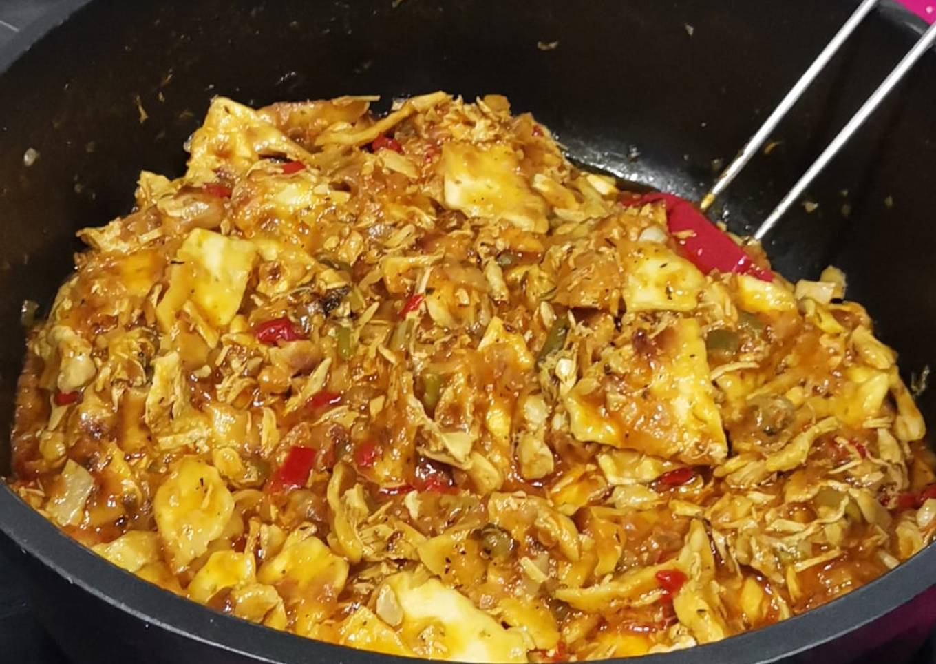 - Partimos en trozos pequeños o medianos la torta y la añadimos. La movemos con movimientos envolventes con cuidado de no romperla y la dejamos cocer 3 o 4 min. Una vez listo, lo servimos en el recipiente que deseemos.