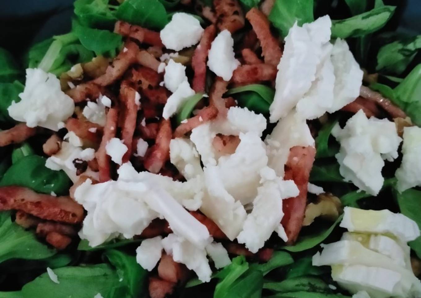 - Echamos el bacon encima, y aceite al gusto. También se le puede añadir vinagre balsámico pero eso va a gusto de cada uno. O sustituir el bacon por salmón ahumado. En mi caso utilice el aceitillo que suelta el bacon para aliñar para no añadir más aceite. Remover y con la misma calor del bacon se derrite el queso de cabra y listo ! Rápido, fácil, sencillo y bueniiiiiisimo
