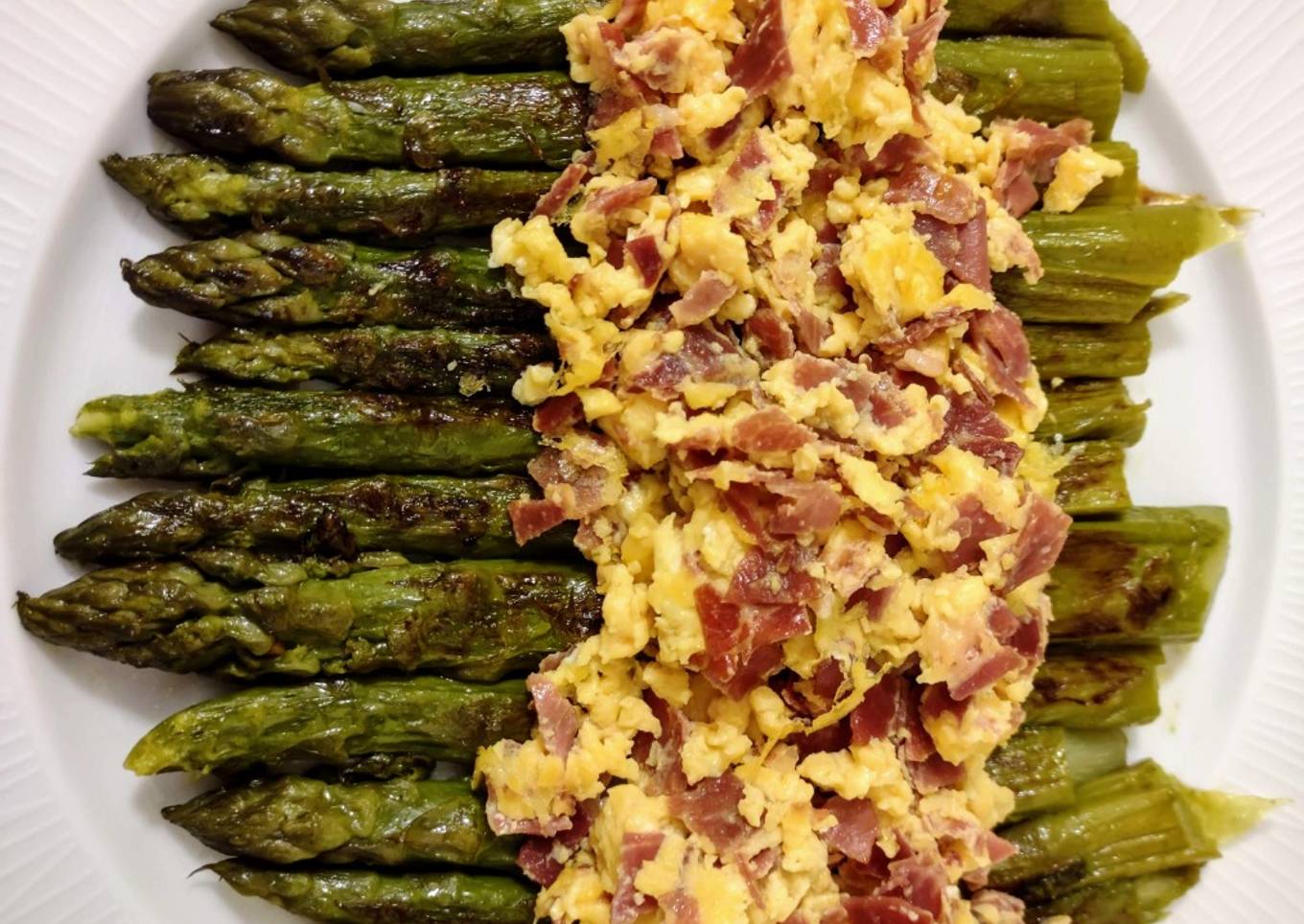 - Echamos en una fuente o un plato los espárragos asados y rociamos por encima el revuelto de jamón y listo nuestro plato.
