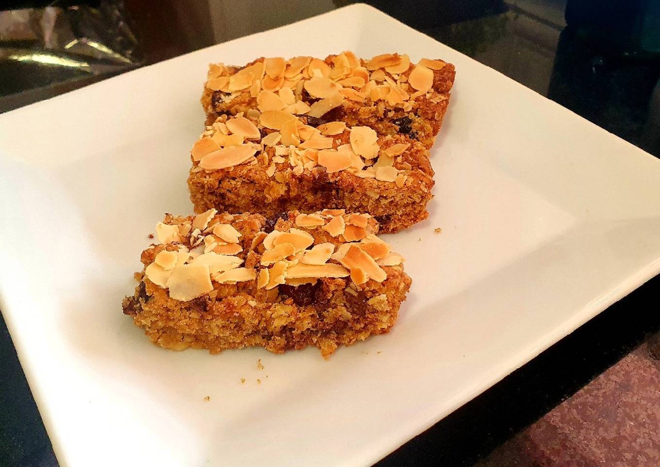 - Finalmente agregamos las almendras laminadas e introducimos el molde en el horno durante unos 25 minutos. Al sacarlo, dejamos enfriar 15 minutos en el molde, luego cortamos las barritas y las dejamos que terminen de enfriarse encima de la rejilla.