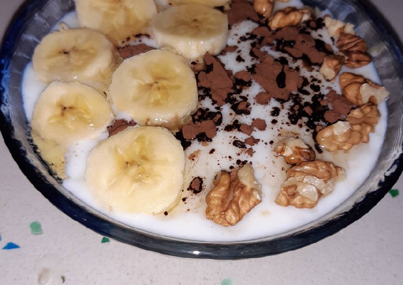 - Servir con topping frutos secos, rodajas de plátano o fresa, trocitos de chocolate o chocolate en polvo, etc