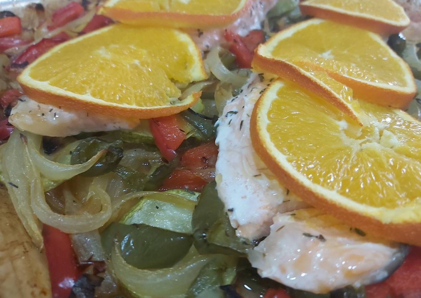 Salm贸n A LA NARANJA馃崐馃崐 al horno con un fondo de verduras
