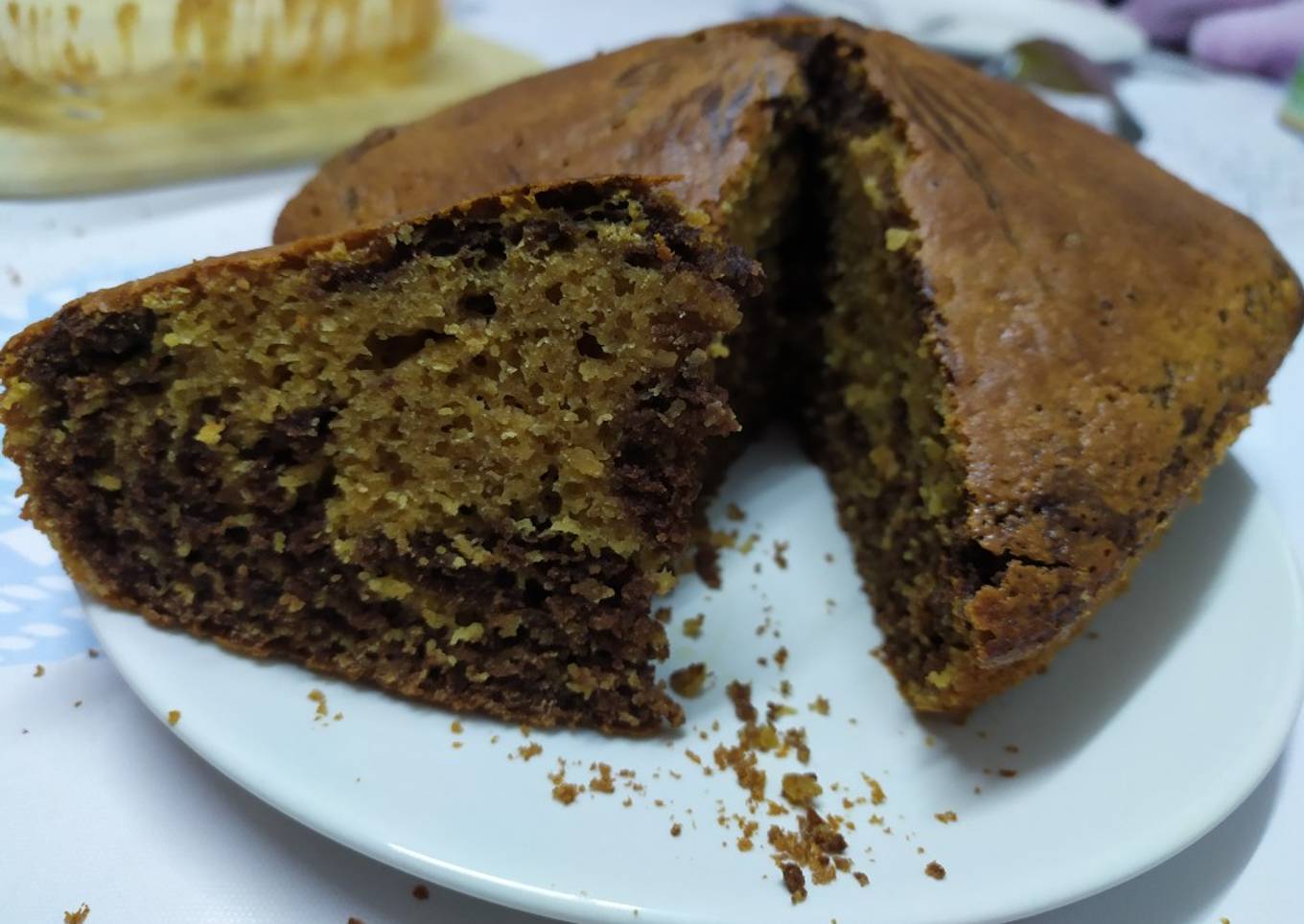 - Echamos la mezcla en el molde alternando una cucharada de cada masa hasta que se nos acaben. Podéis decorar con un palillo la superficies del bizcocho.