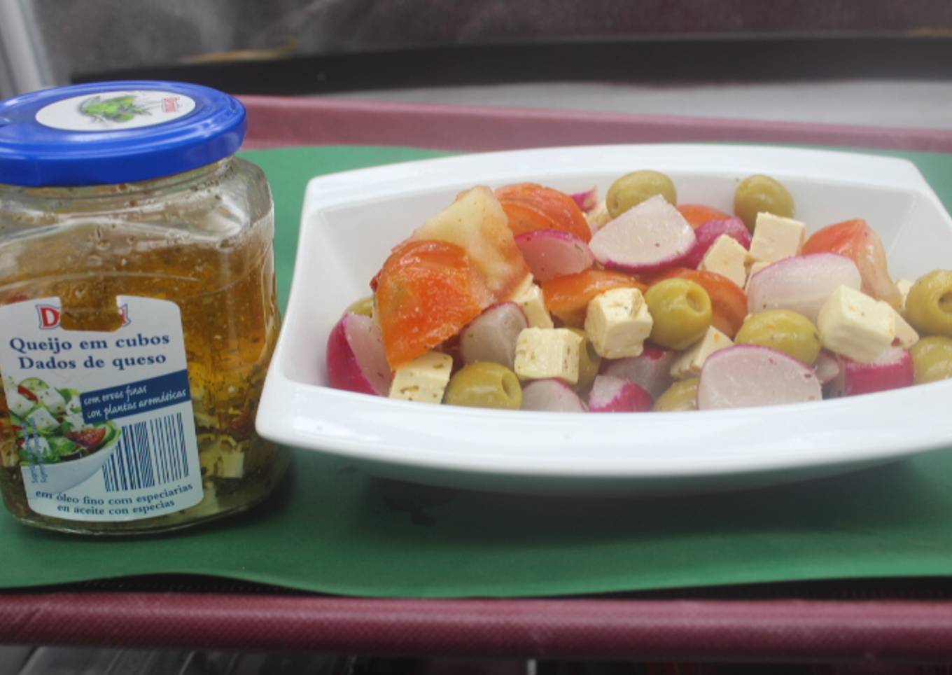Hoy traigo una ensalada diferente, con daditos de queso en aceite, rabanitos, aceitunas y tomate, así de simple y diferente.