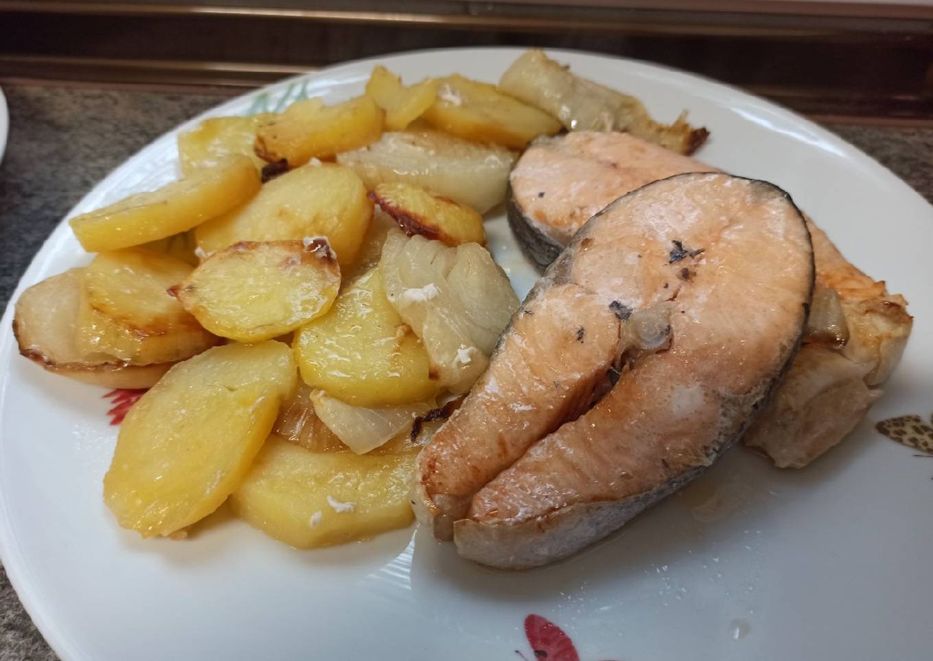 Just in addition, the time it takes to cook Salmón al horno con patata y cebolla estimated approx 1h 15min.