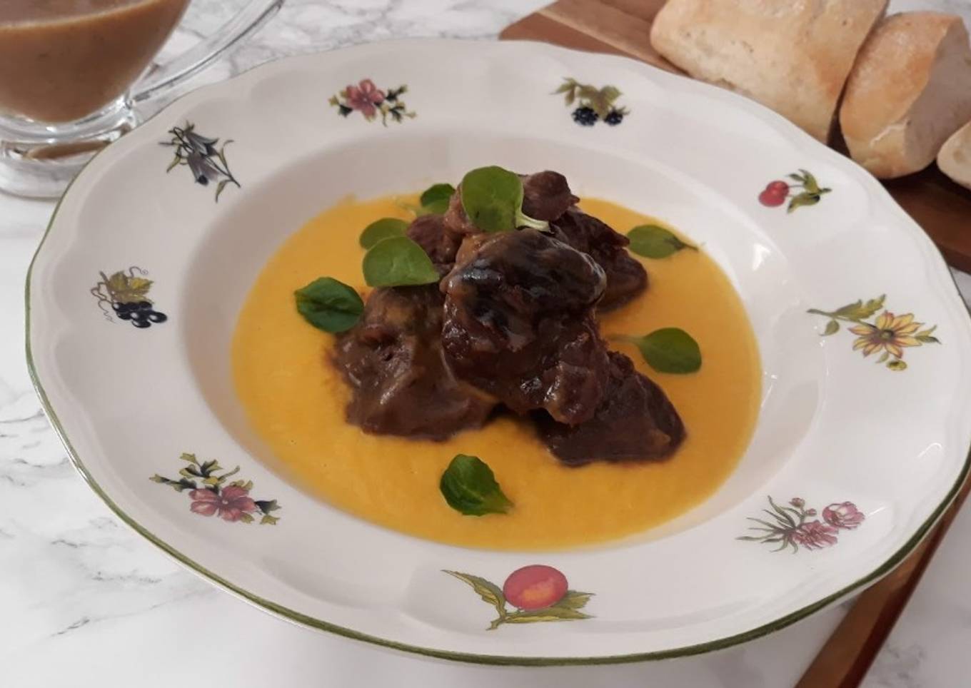 Ternera con ciruelas sobre crema de calabaza