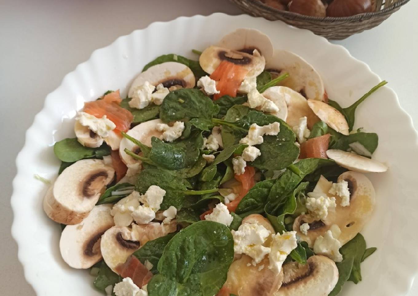 - Poner la espinaca en un bol, por encima repartir el salmón, los champiñones, la cebolleta y el queso de cabra.