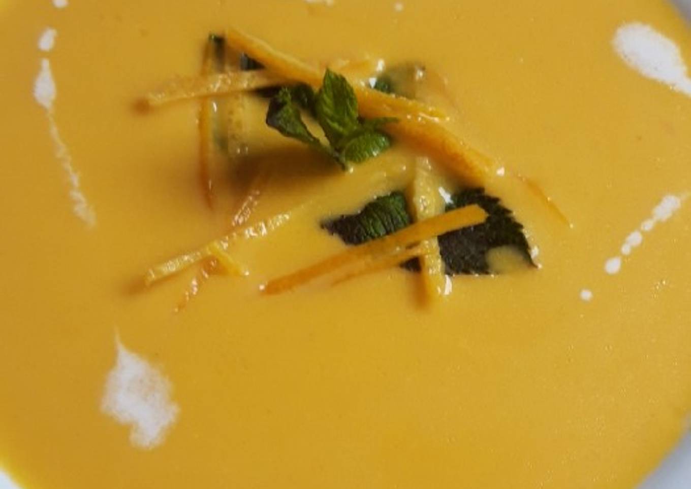 - Añadir una nuez de mantequilla, mezclar bien. Servir caliente o frío y refrescar con la ralladura de naranja, un hilo de nata y unas hojas de menta. Buen provecho
