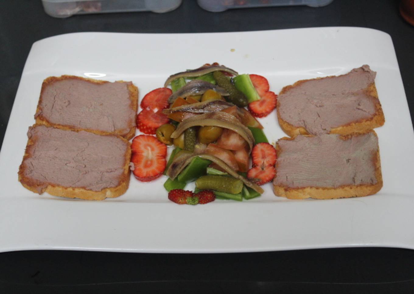 - Untamos las rebanadas de pan tostado con el paté y repartimos entre dos platos.