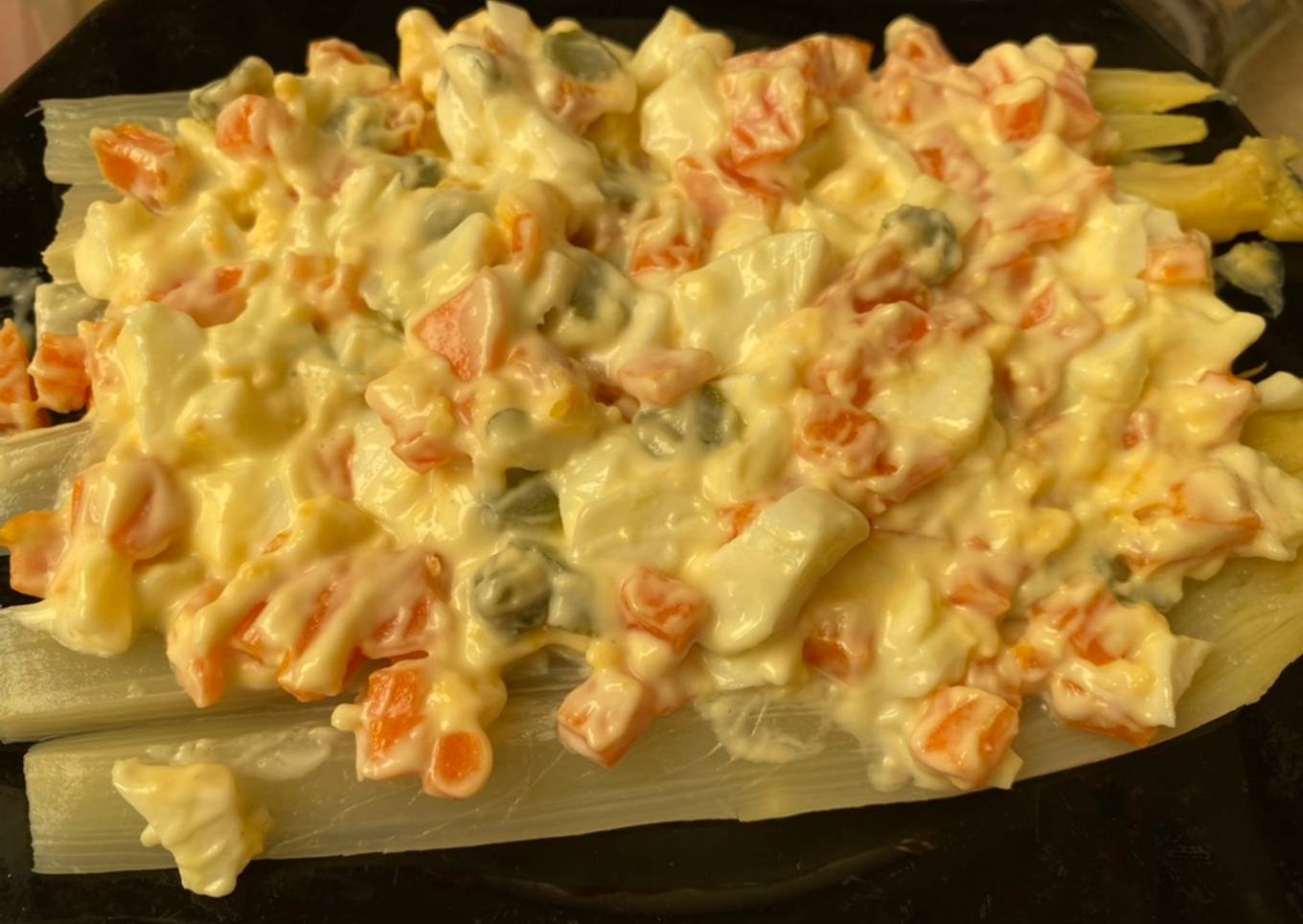 - Picar el huevo, la zanahoria y el pepinillo finamente. Mezclar con la alioli
