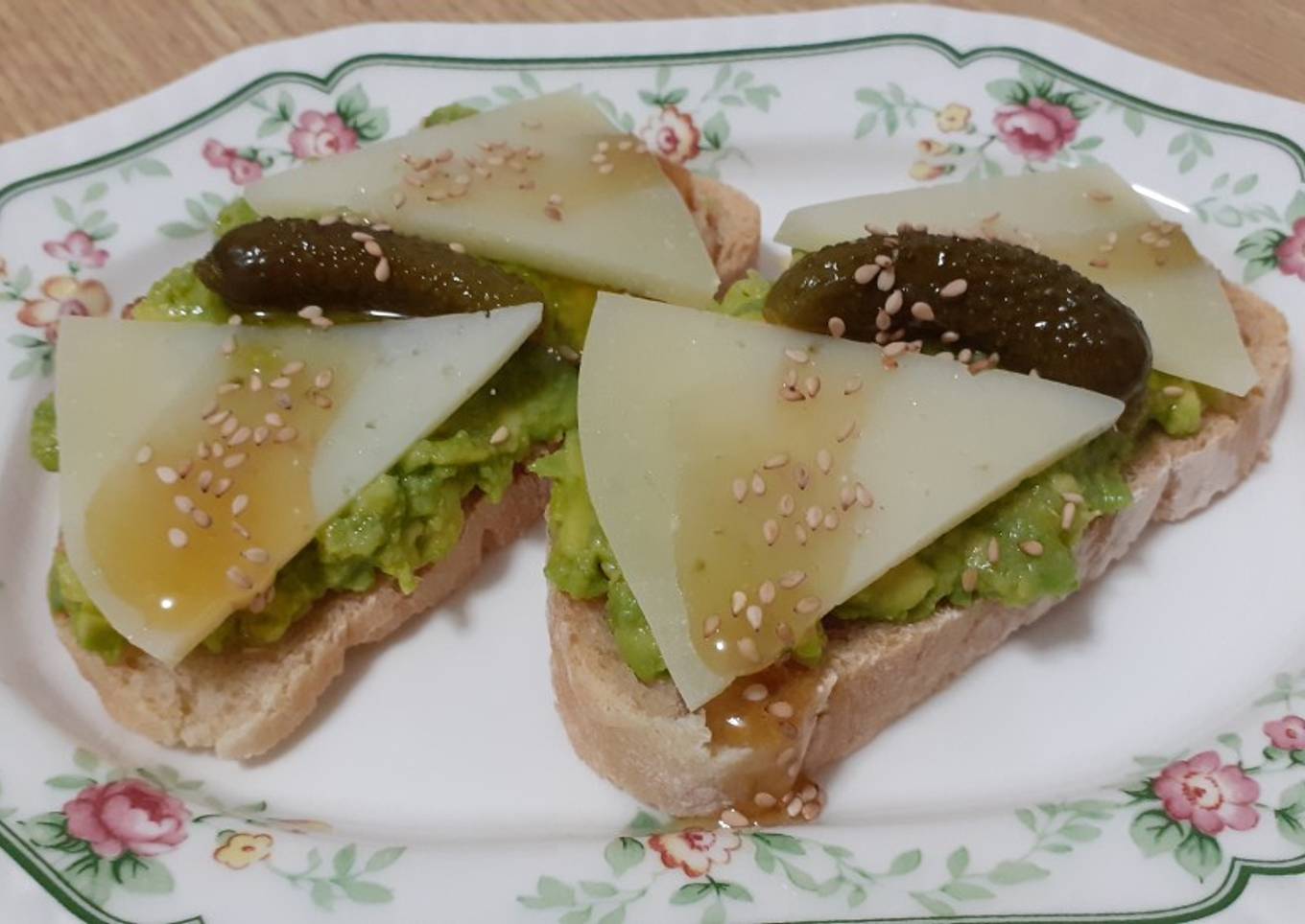 - Untamos el pan con la pasta de aguacate, ponemos el queso en lonchas finas, los pepinillos, rociamos un poco de miél y el sésamo, y ya las tenemos para disfrutar..