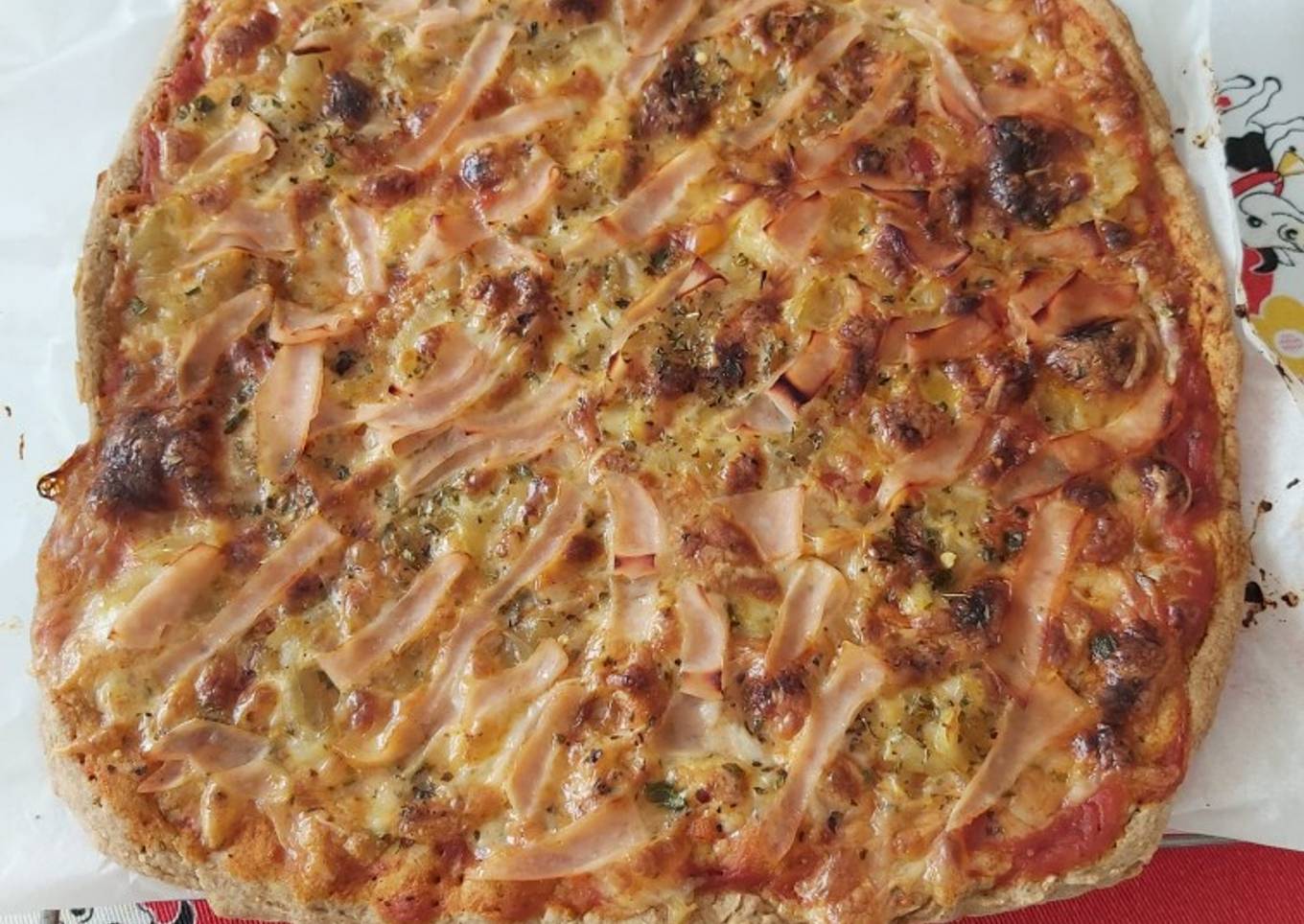 Pizza de pavo, cebolla caramelizada y miel. Base casera integral