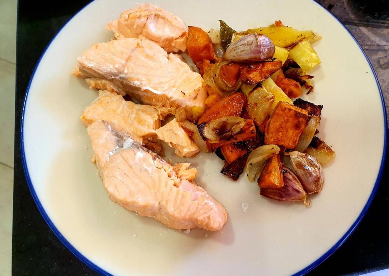 Salmón al vapor con sabor y verduras al horno