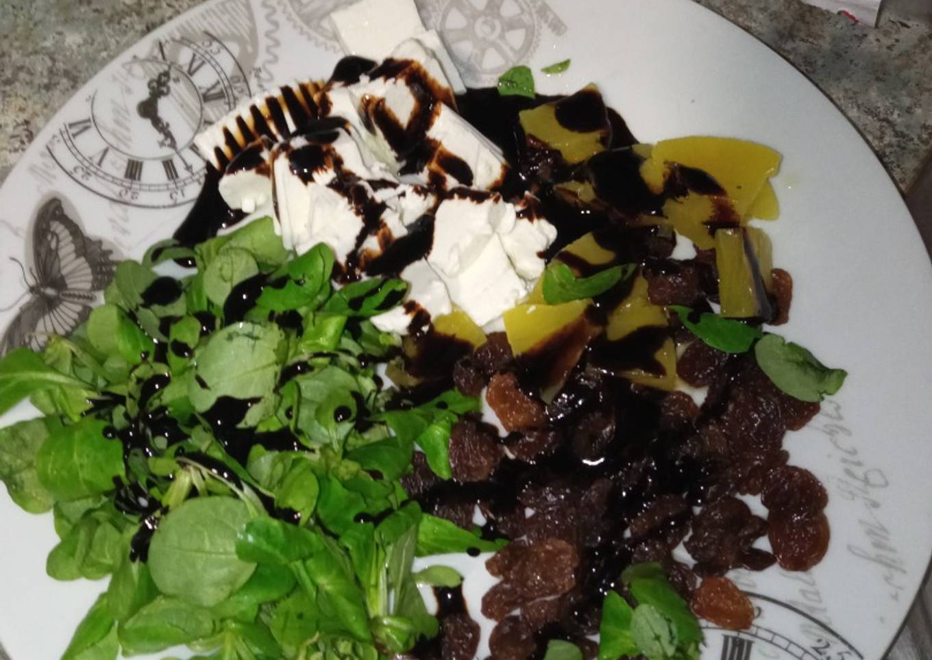 - Una vez cortada la echamos junto a los canónigos y añadimos la crema balsámica y lo revolvemos