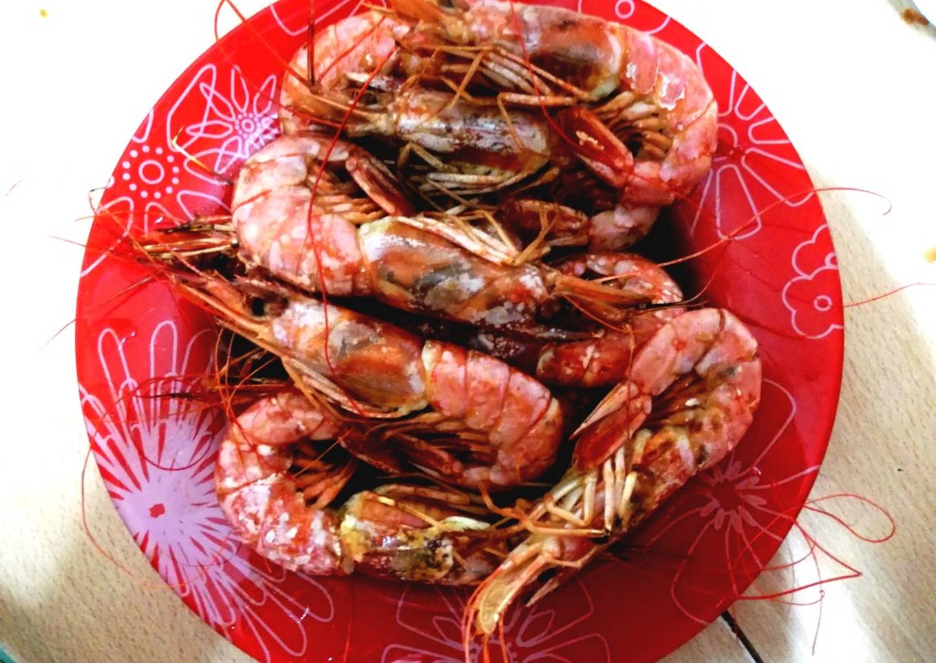 - Pon sobre una fuente de cristal los gambones, echando por encima el vasito de Pedro Ximénez y luego la sal en escamas