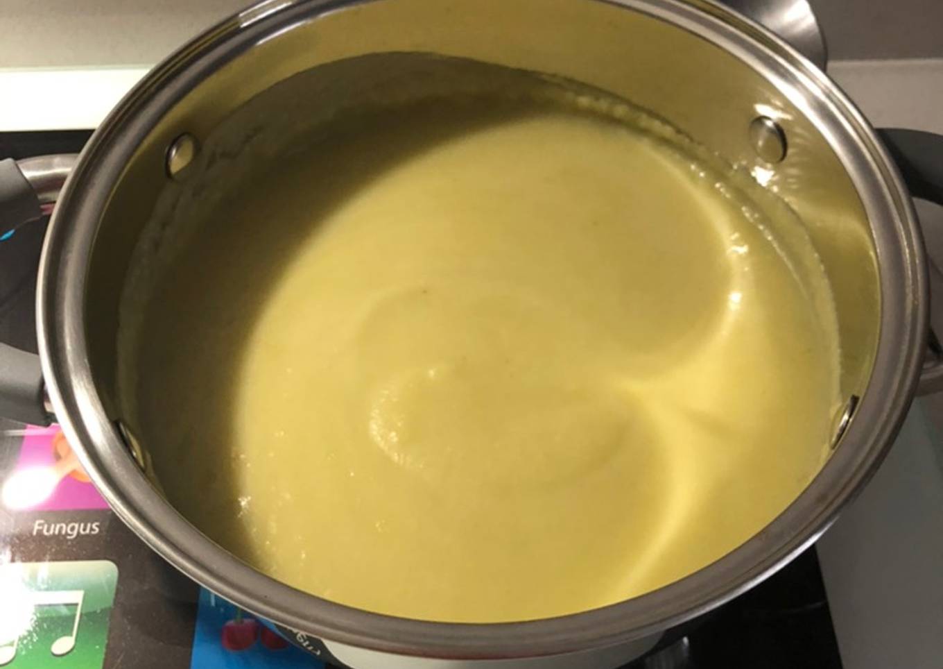 - Incorporar el agua/caldo, la patata y la sal. Orificio tapado y programar 20 minutos a velocidad 1 y 120 grados.