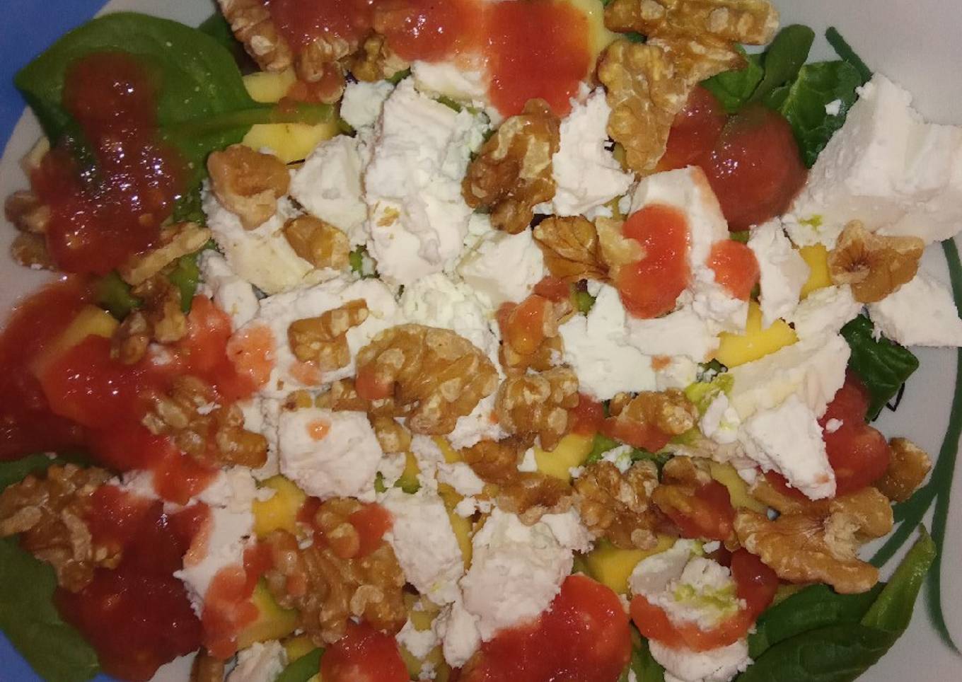 Aprovechando que tenía sobras de espinacas, mango y queso de cabra .Ha salido esta rica ensalada.