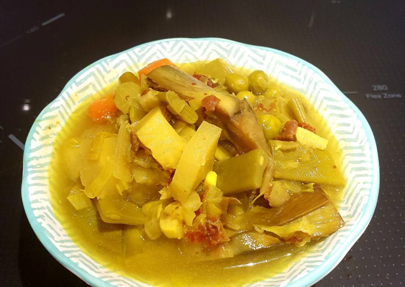 Ayer hice esta menestra para comer y estaba riquísima. La hice al fuego muy lento (3) porque tenía varias reuniones y no quería interrumpirlas levantándome para ir a la cocina, de ahí la larga duración del tiempo. A fuego moderado solo tardaría una hora en hacerse. La cebolla, el ajo, las alcachofas, la cúrcuma.... todos alimentos súper sanos porque tenemos que cuidarnos por dentro y por fuera 💪🏻Puedes usar las verduras que tengas en casa y prescindir del jamón si quieres versión vegetariana.