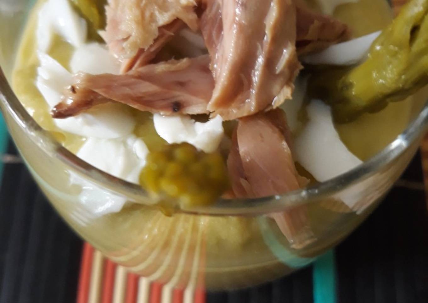 - Una vez finalizado lo ponemos a enfriar en el frigorífico y a la hora de servir lo distribuimos en vasitos y Le ponemos encima trozos de bonito en aceite, las puntas de espárrago y la clara de los huevos troceadas.