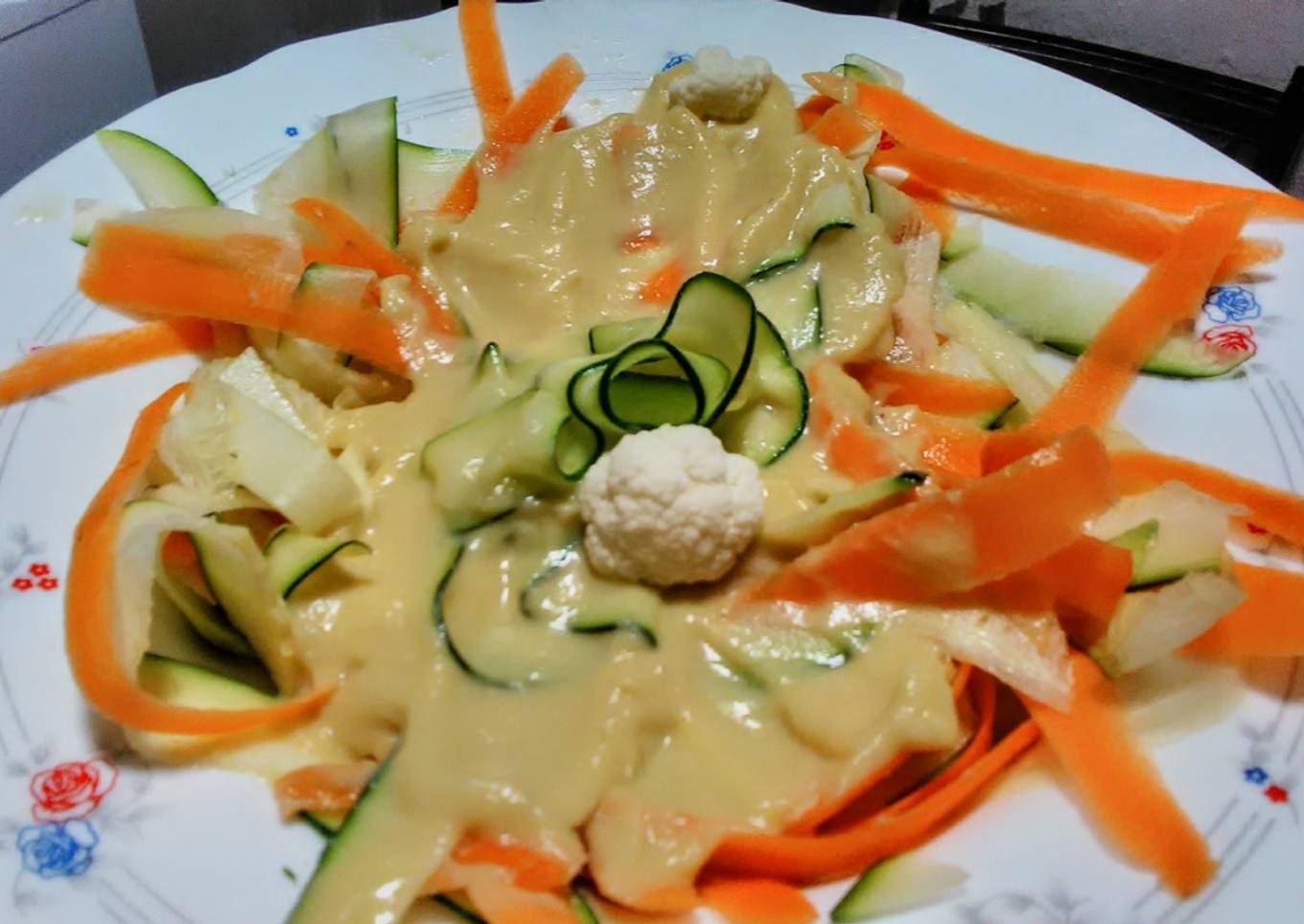 "Tallarines" de calabacín y zanahoria con "bechamel" de coliflor
