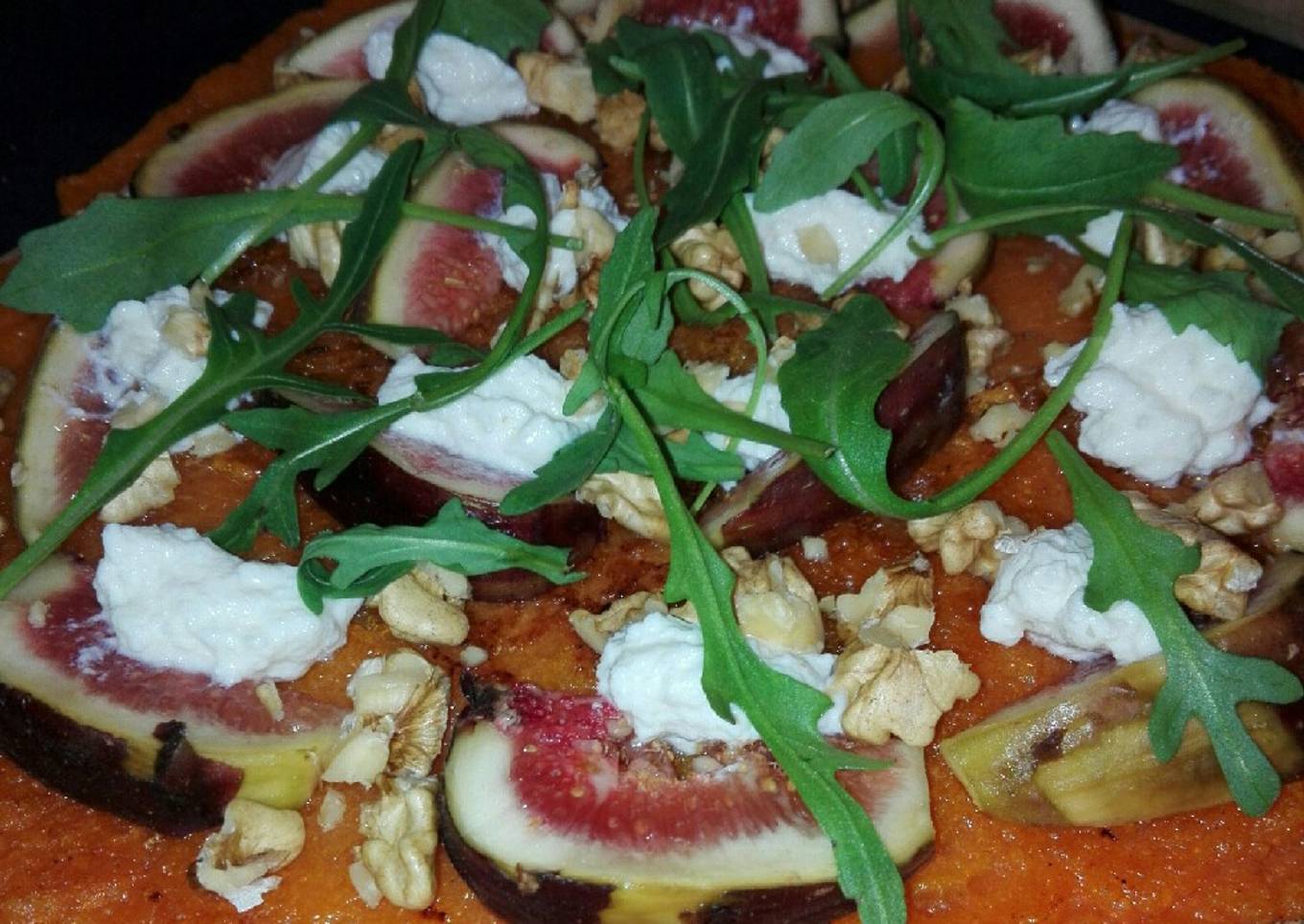 - Sacar de la sartén y rellenar la base con la rúcula, el queso, las nueces, los higos y un hilito de aceite de oliva por encima. Aunque podéis rellenarla a gusto de cada uno adaptando los ingredientes a vuestro antojo.